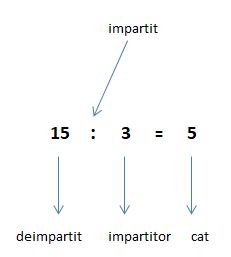 La o impartire, primul numar poarta numele de deimpartit, al doilea de impartitor, iar rezultatul impartirii se numeste cat.